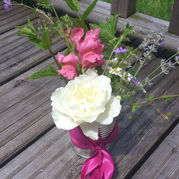 We managed to pull together a small posy of flowers to take to see Mr A’s Grandma yesterday (I know, how very vintage, for someone who constantly bemoans the vintage thing). But I am wishing we had more flowers in the garden. The white climbing rose bush is lovely and flowers all summer, but the peonies as always decided to flower in a thunderstorm and now lie in a tragic mess on the tiles. Poppies are springing up left right and centre, but just like the peonies are gone in a flash. I’m waiting for all the wild flowers I planted.